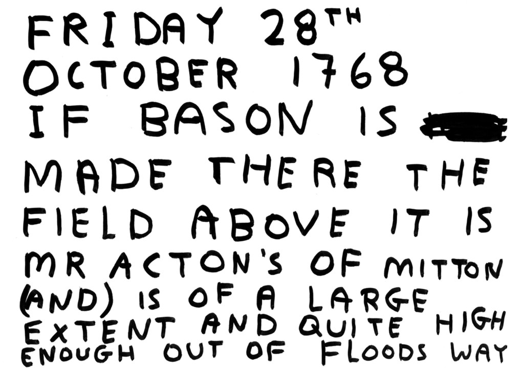 On the 27th October 1768, John Fennyhouse Green was assisting John Dadford in setting out a culvert at Broadwaters when John Baker, the Clerk of Works, directed Green to “go down to the Stour’s Mouth and observe where the Canal might be brought to the Severn.” In his Day Book for 1 November 1768, Green records his visit to “Mr Price’s at Stour’s Mouth” (now the Angel Inn) and to assess the potential of the immediate landscape as the location for the inland port, “If canal is bro’t above… If Bason is made there…” He was looking for a piece of land that was both broad enough to accommodate what is now the Clock Basin and which sat “high enough out of flood’s way.” John Acton, the local Church Warden at Lower Mitton, owned just such a field – a stubble field, measuring something over 5 acres (20,000 m2) and lying high enough above Mr Roberts’ meadow that ran along the River Severn.