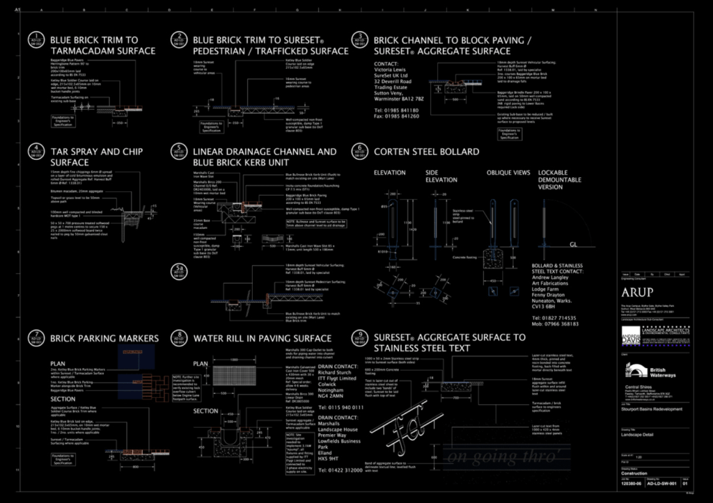 pro/POSIT collaboration with British Waterways on masterplanning of Brindley’s historic canal basins leading to design implementation and parallel commissioning programme, and Andrew Davis Partnership and others on detailed design for landscape works.