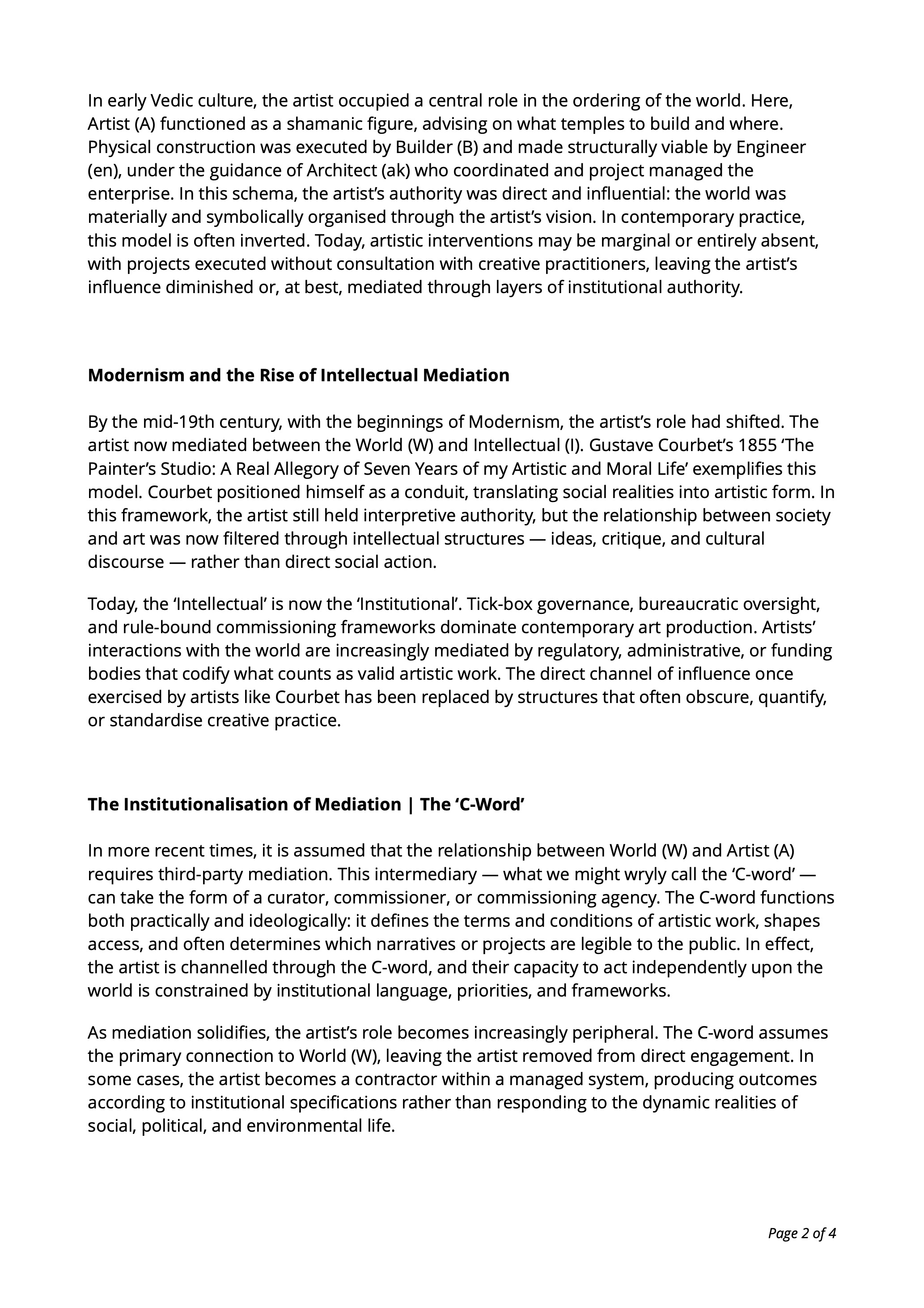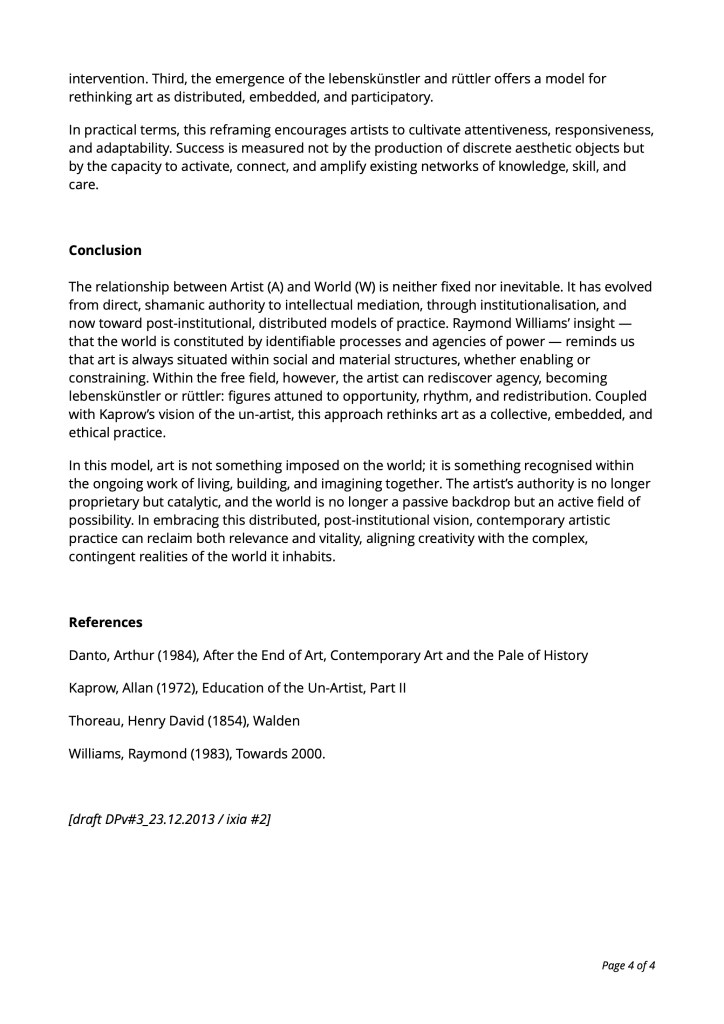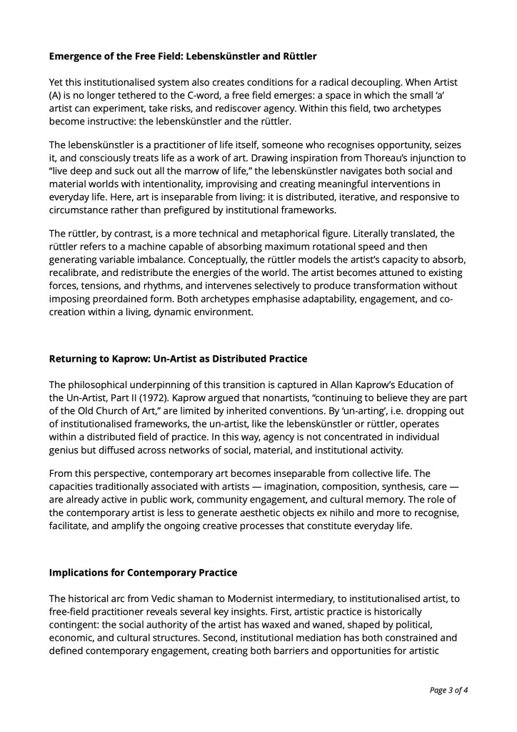 The ‘artist of place’ represents a critical shift in contemporary art: away from autonomous objects and towards embedded, ethical practice attentive to social, historical, and lived realities. By listening, excavating, and revealing, the ‘artist of place’ foregrounds the meanings inherent in locations and communities. The ‘Mass Artist’ extends this perspective, situating artistic capacity within the distributed systems that constitute collective life. Here, art is inseparable from governance, infrastructure, community, and everyday labour.