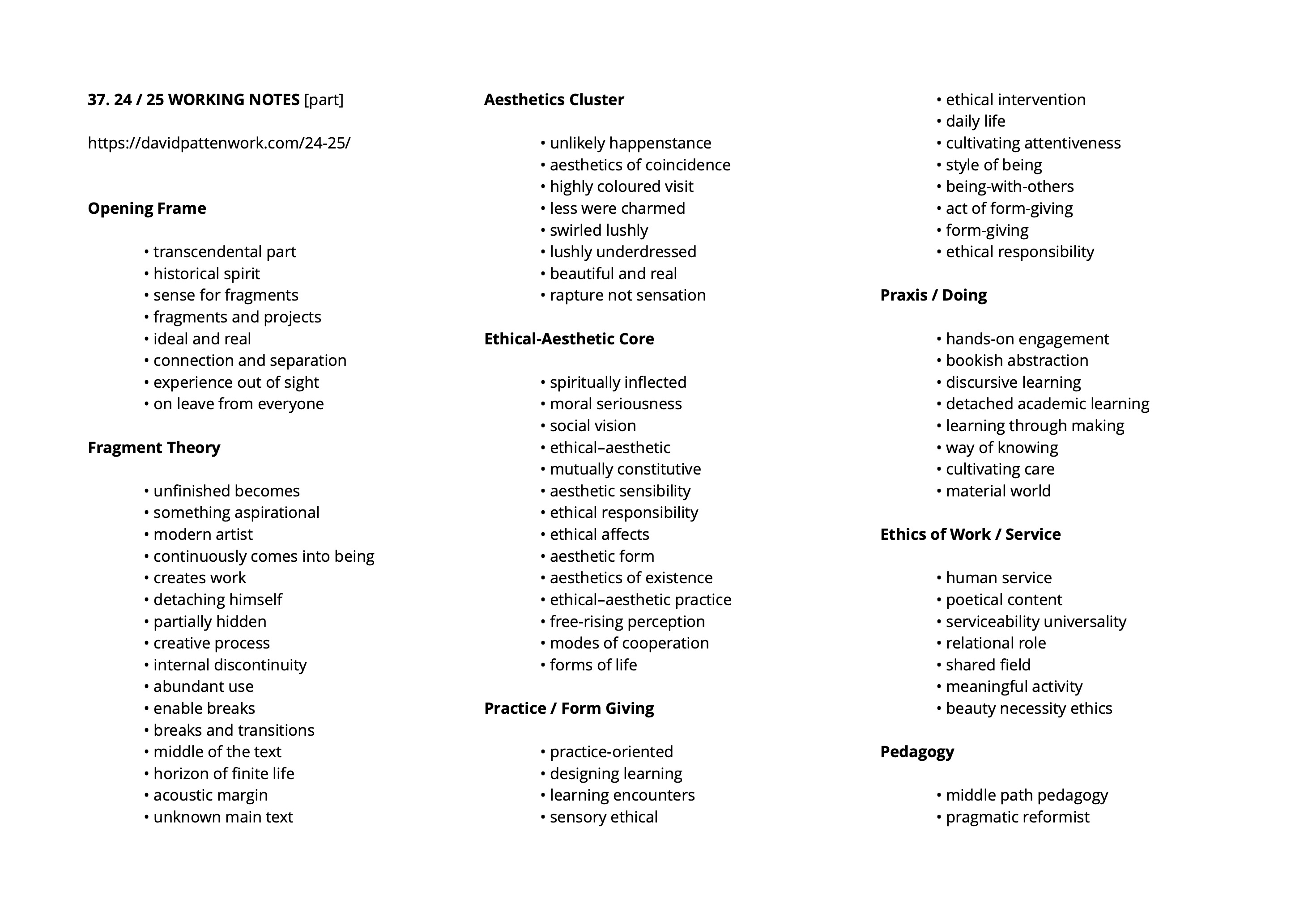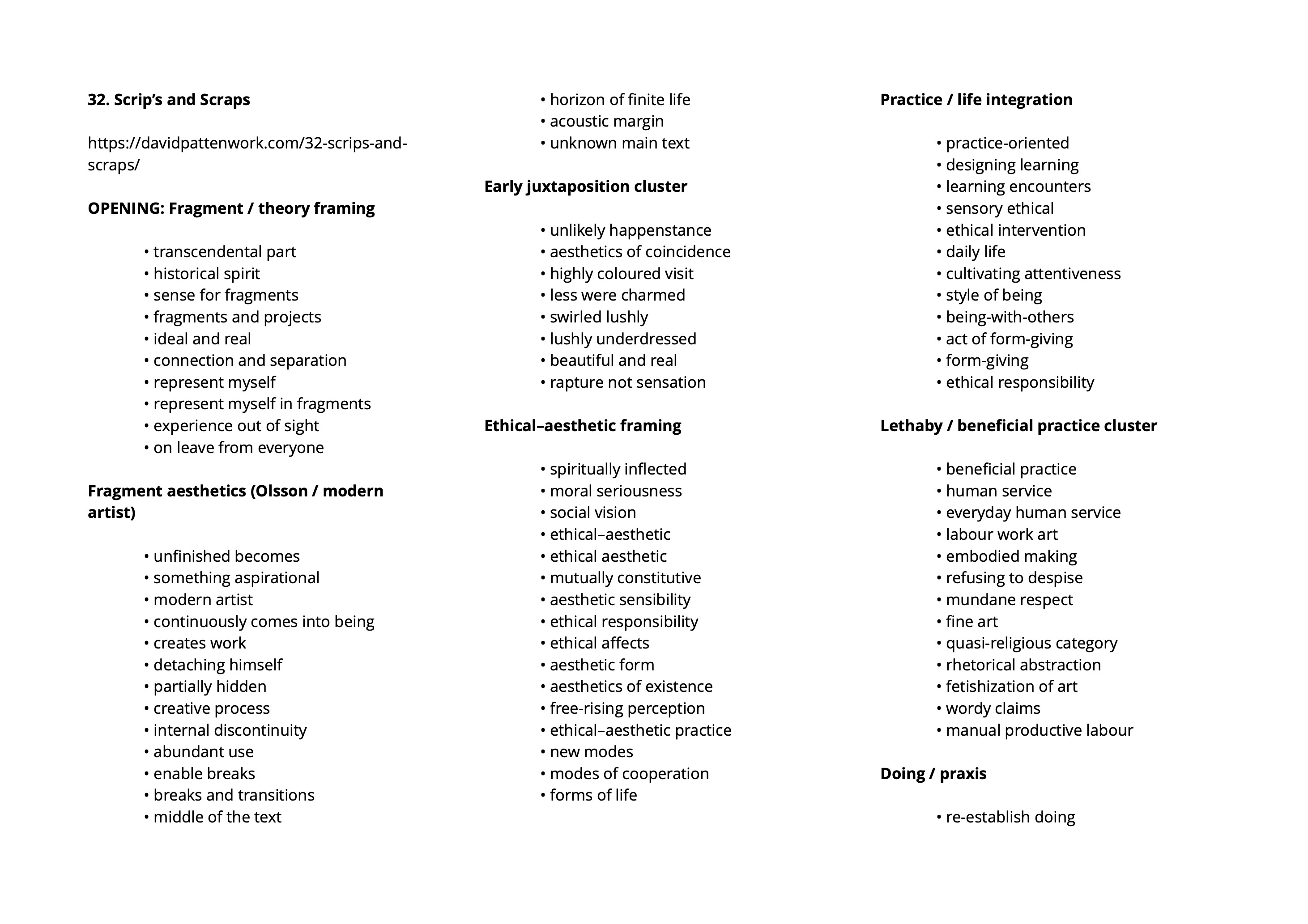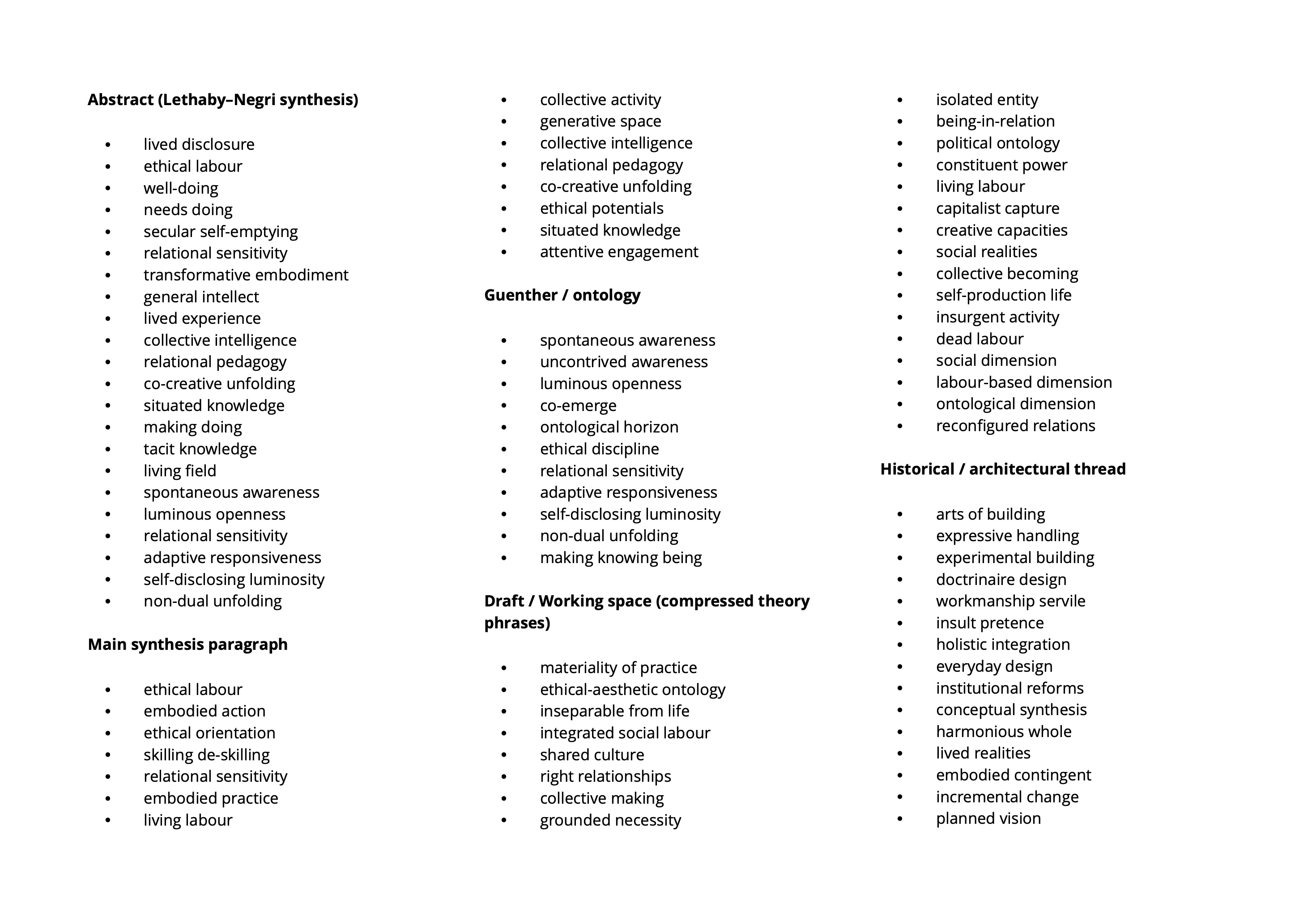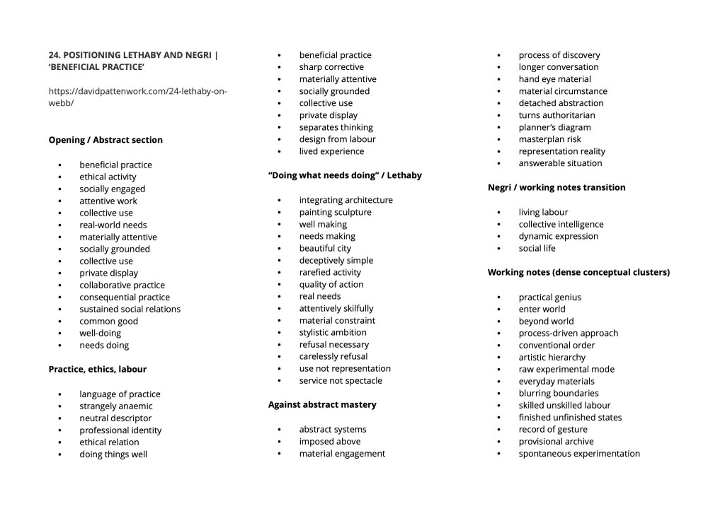 31. Positioning Clusters Working Space 2014 / 2026 1. compressed conceptual units 2. non-obvious pairings 3. high-density phrases 4. juxtapositional fragments 24. Beneficial Practice | Lethaby & Negri 32. Scrip’s & Scraps | Lethaby 37. 2024/2025 Working Notes Share this: Share on X (Opens in new window) X Share on Facebook (Opens in new window) Facebook Like Loading...