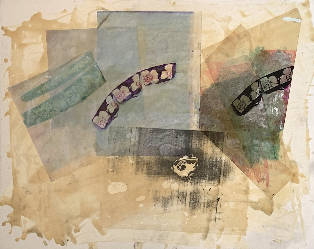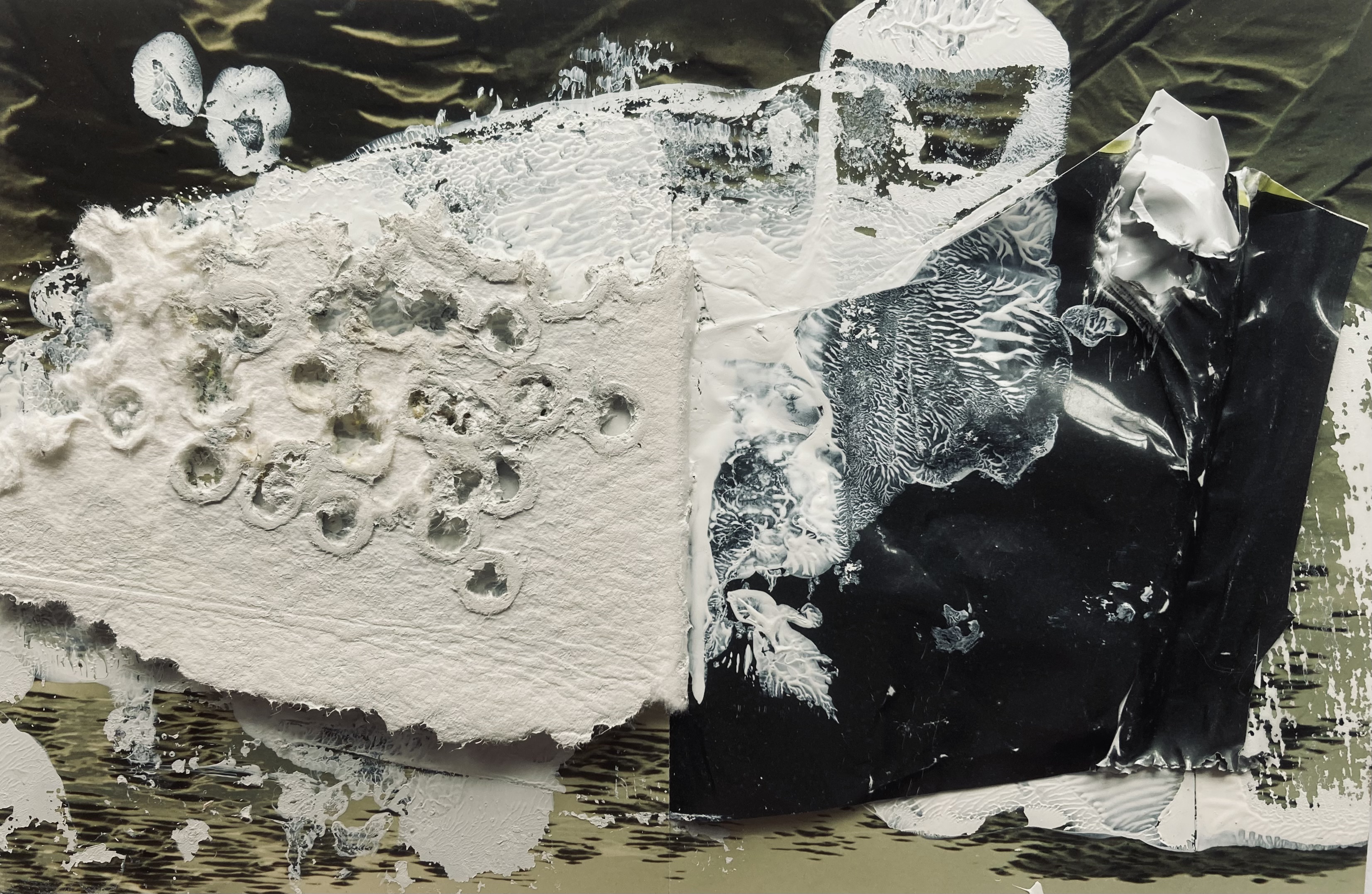 • Physical layering: highlighting techniques using dust, paper, sand, and collage—creating frames within frames and exploring depth and surface.