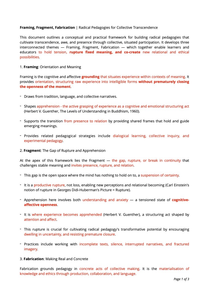 The work proposes an artistic praxis rooted in fragmentation, material experimentation, open-ended processes, and temporal contingency. It resists finality—whether in form, meaning, or authorship—and instead encourages a continuous unfolding of meaning. Drawing on Cubist collage, Minimalism, literary fragments, and spiritual philosophy, the work lives in the open seams between thresholds, inviting viewers and makers alike to become part of its making and remaking.