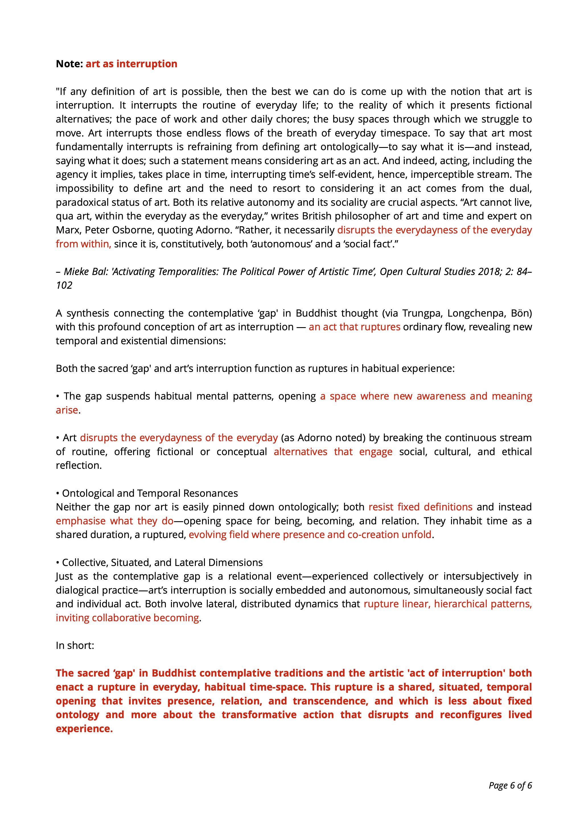 against framing conditions [institution of art + means-ends activity] a new life praxis from a basis in art, renouncing specific goals in favour of a pervasive openness / a new way of perceiving