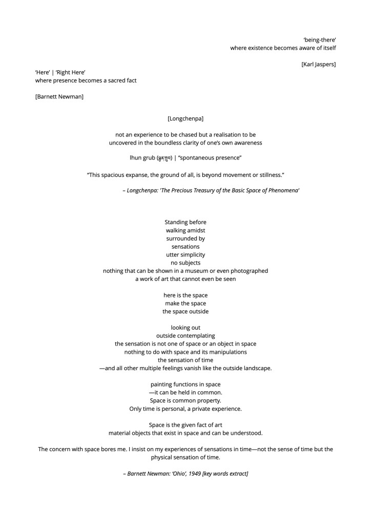 • Im/potentiality: reflecting, via spiritual and philosophical references (James Nayler, Longchenpa, Buytendijk), on the potential to not-actualise and resist normative narratives.