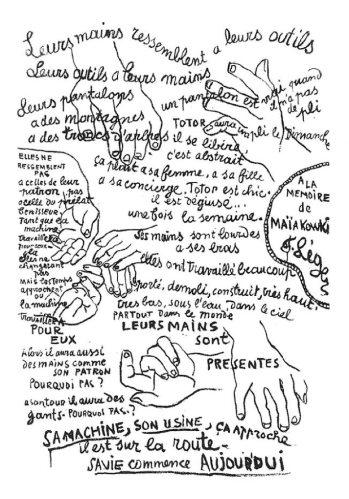 Fernand Léger’s 1951 ‘The Hands, Homage to Mayakovsky’ [oil on canvas, private collection] celebrates manual labour as the site of creativity, solidarity and political force. Text and image compete for space — the poem pressing against monumental hands insisting on agency, capability and material intelligence.