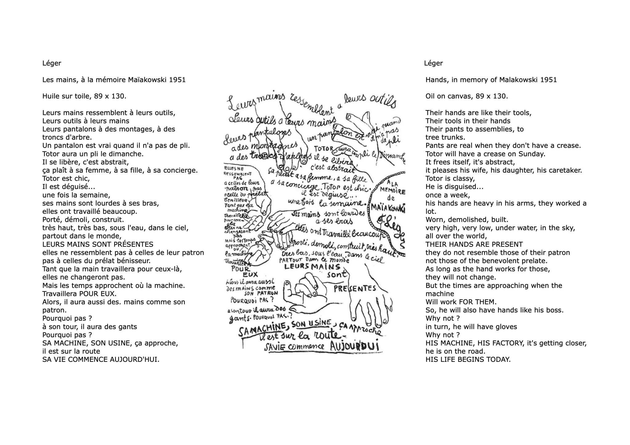 Fernand Léger’s 1951 ‘The Hands, Homage to Mayakovsky’ [oil on canvas, private collection] celebrates manual labour as the site of creativity, solidarity and political force. Text and image compete for space — the poem pressing against monumental hands insisting on agency, capability and material intelligence.
