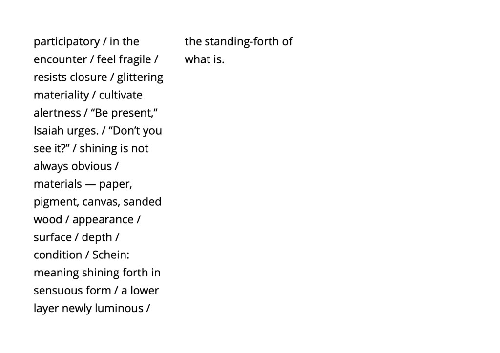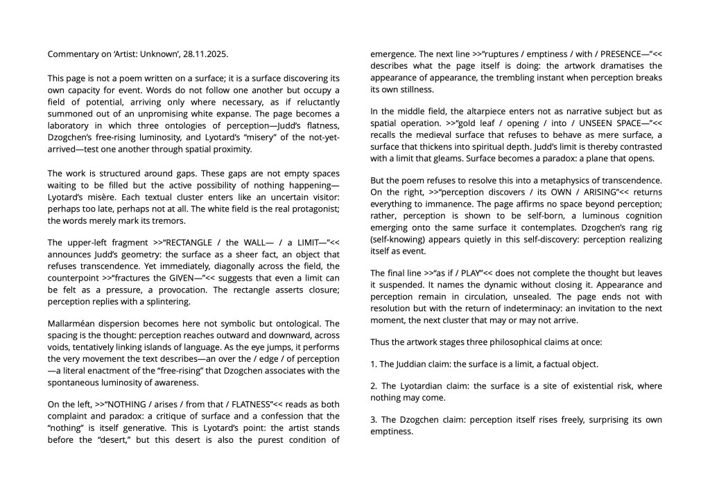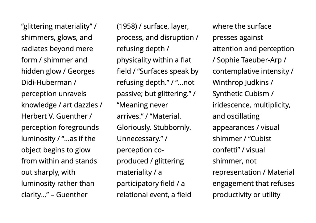 Surface materiality as Indriyeśvara’s buddha-play / facticity + susceptibility / perception / the eye navigates gaps, aligns fragments, and shapes temporary coherences = perception finding itself = seeing as both aesthetic and ethical = beneficial practice / transforming the conditions of relation and attention rather than producing a consumable outcome.