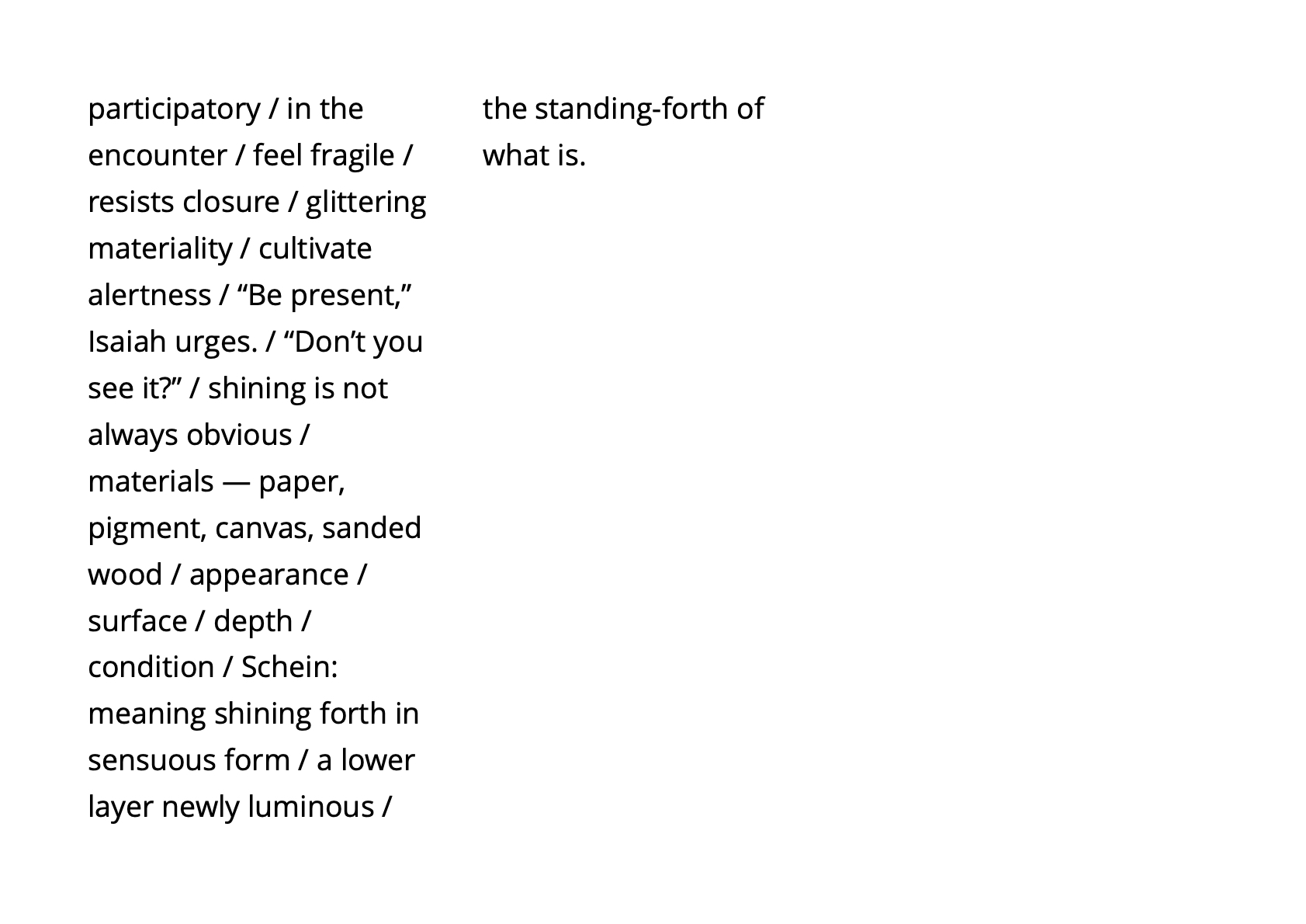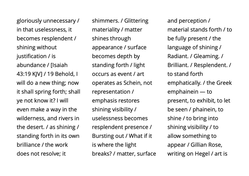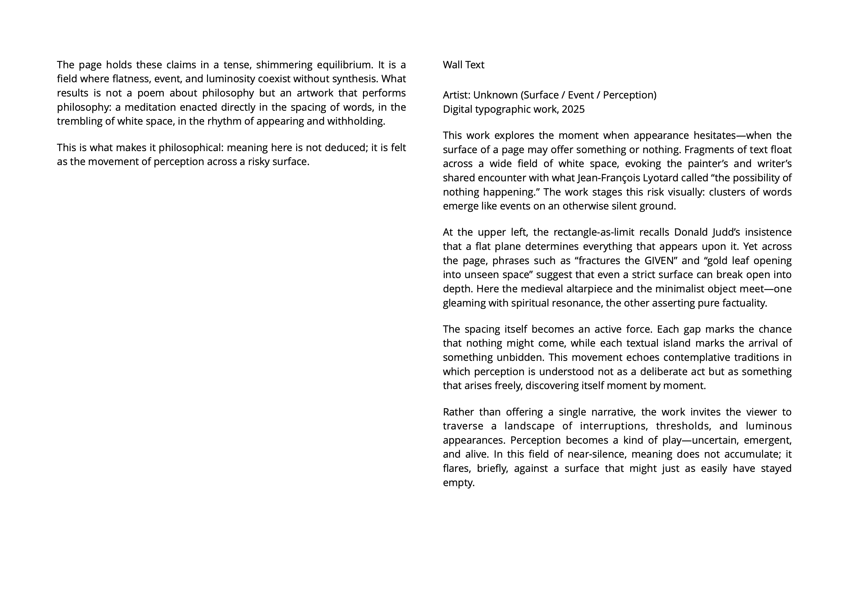 To attend and to let perception find itself anew as the work of both awakening and art / surface / not image nor message but situation: perception revealed as an event in progress / habits of ordering and the undoing of certainty / a play of absence and emergence, a relational field in which attention must continually adjust, anticipate, and recompose / perception not as a means of recognition but as a form of participation—a found perception, co-created by matter and awareness.