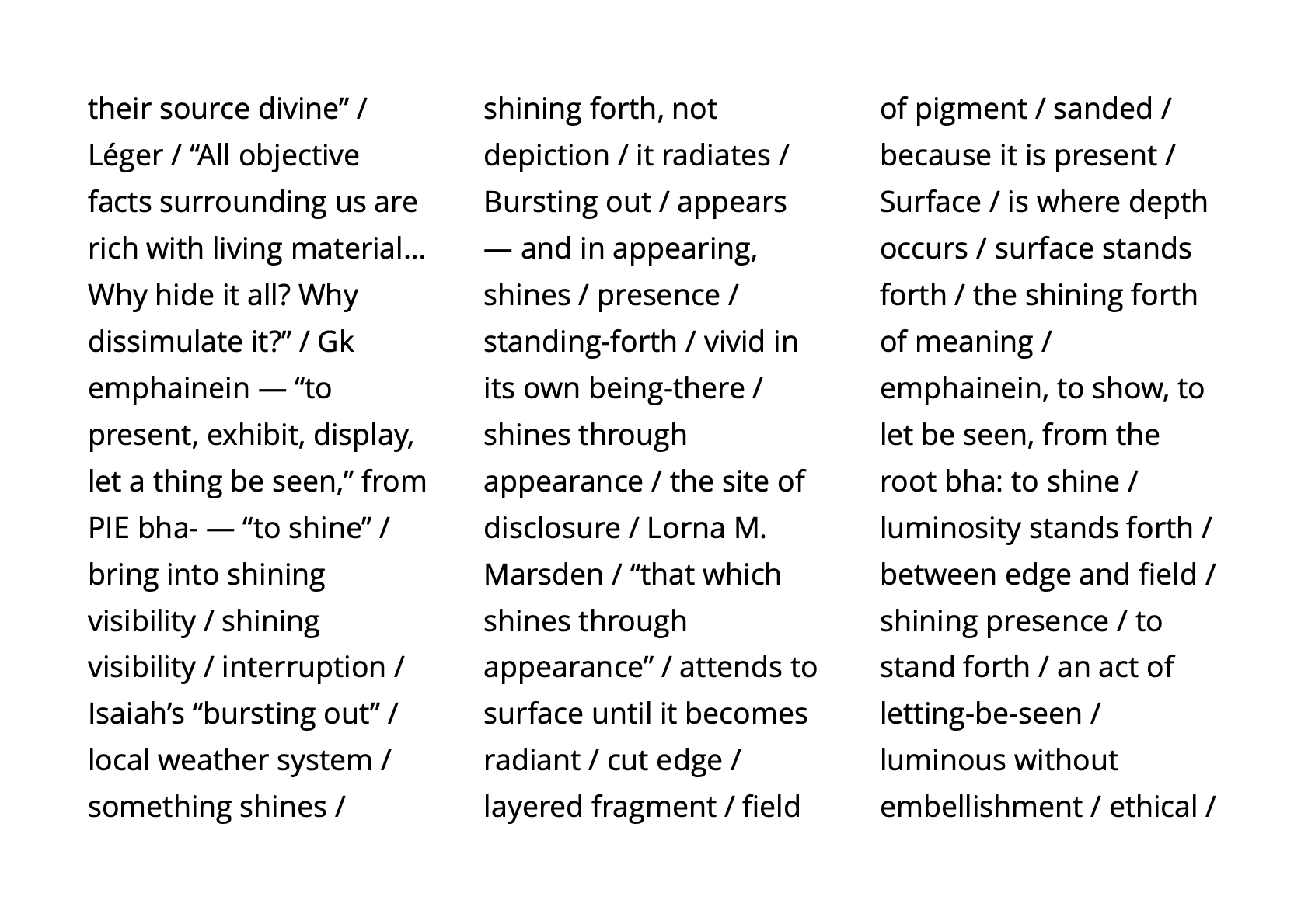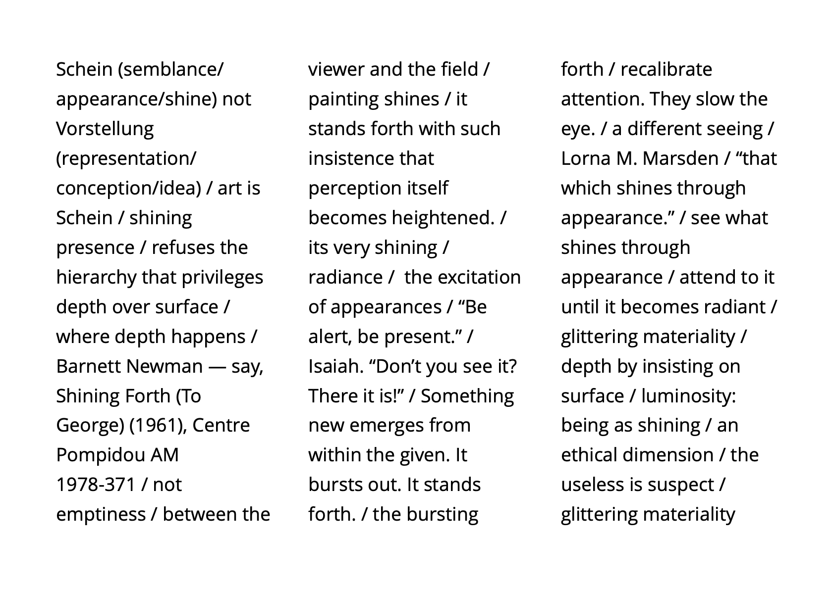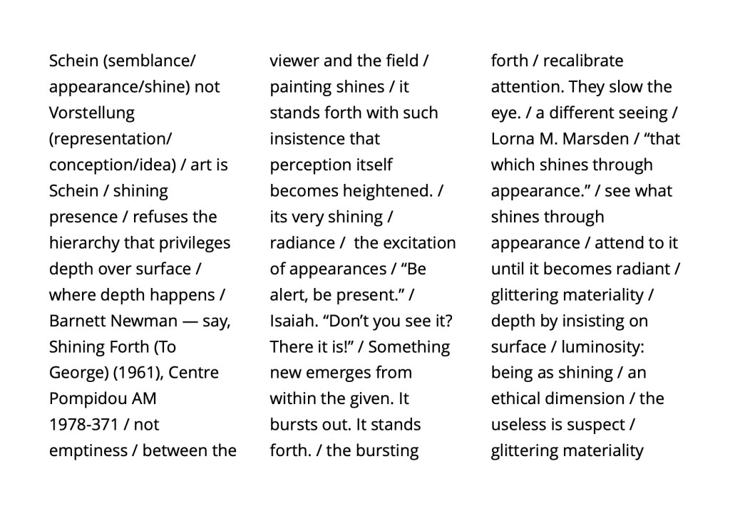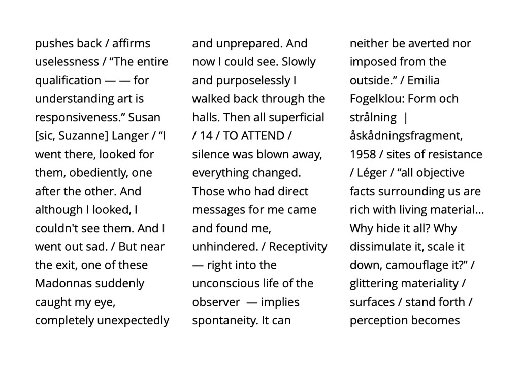 To attend and to let perception find itself anew as the work of both awakening and art / surface / not image nor message but situation: perception revealed as an event in progress / habits of ordering and the undoing of certainty / a play of absence and emergence, a relational field in which attention must continually adjust, anticipate, and recompose / perception not as a means of recognition but as a form of participation—a found perception, co-created by matter and awareness.