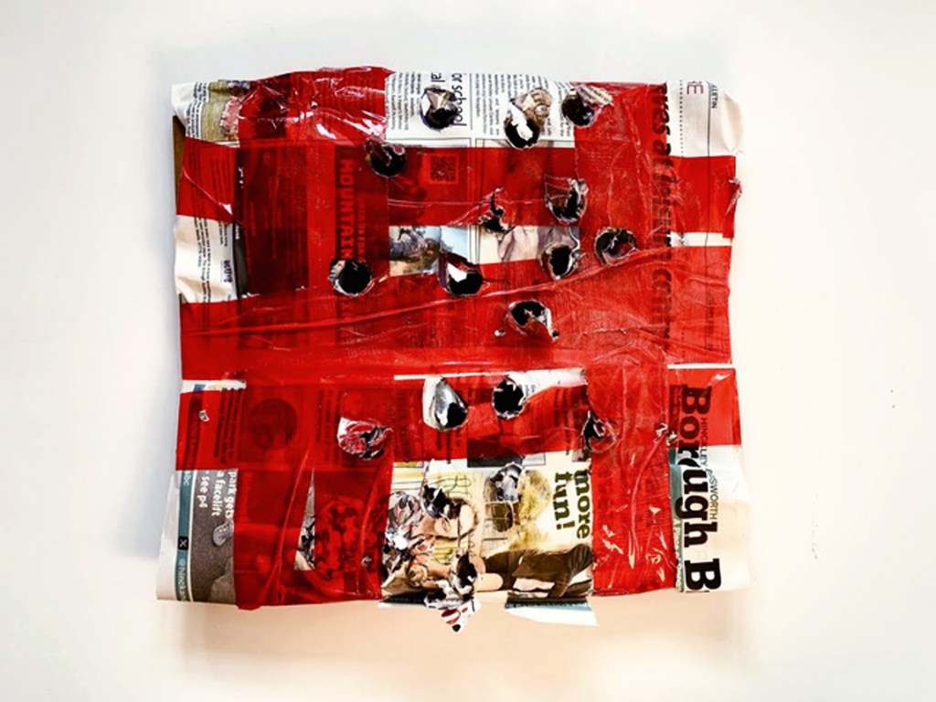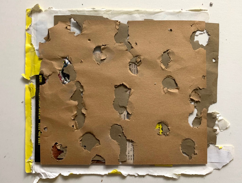 [12.12.2025] / hybrid-form within the expanded field / emphasising material presence and physical process / a negotiation between surface, void, and depth / an occupation of both surface and shallow relief through overlapping planes, irregular edges, and physical layering / conceptually between painting, sculpture, and collage / …material emphasis and process / foregrounding material disruption and process / physicality and presence / process over illusion—tearing, layering, and revealing underlying strata rather than simulating depth / a refusal of unified pictorial space / a layering of material / between -> neither -> nor = in the expanded field of related practices = relations among categories rather than by belonging to a single medium / “not painting, not sculpture” = hybrid event / relief-like layering -> sculptural depth + overall flattened presentation and reliance on surface materials recall painting and collage / surface, object, and space interpenetrate rather than align / material disruptions / refusal to fix / actively negotiating a space between painting and sculpture = material and theoretical complexity.