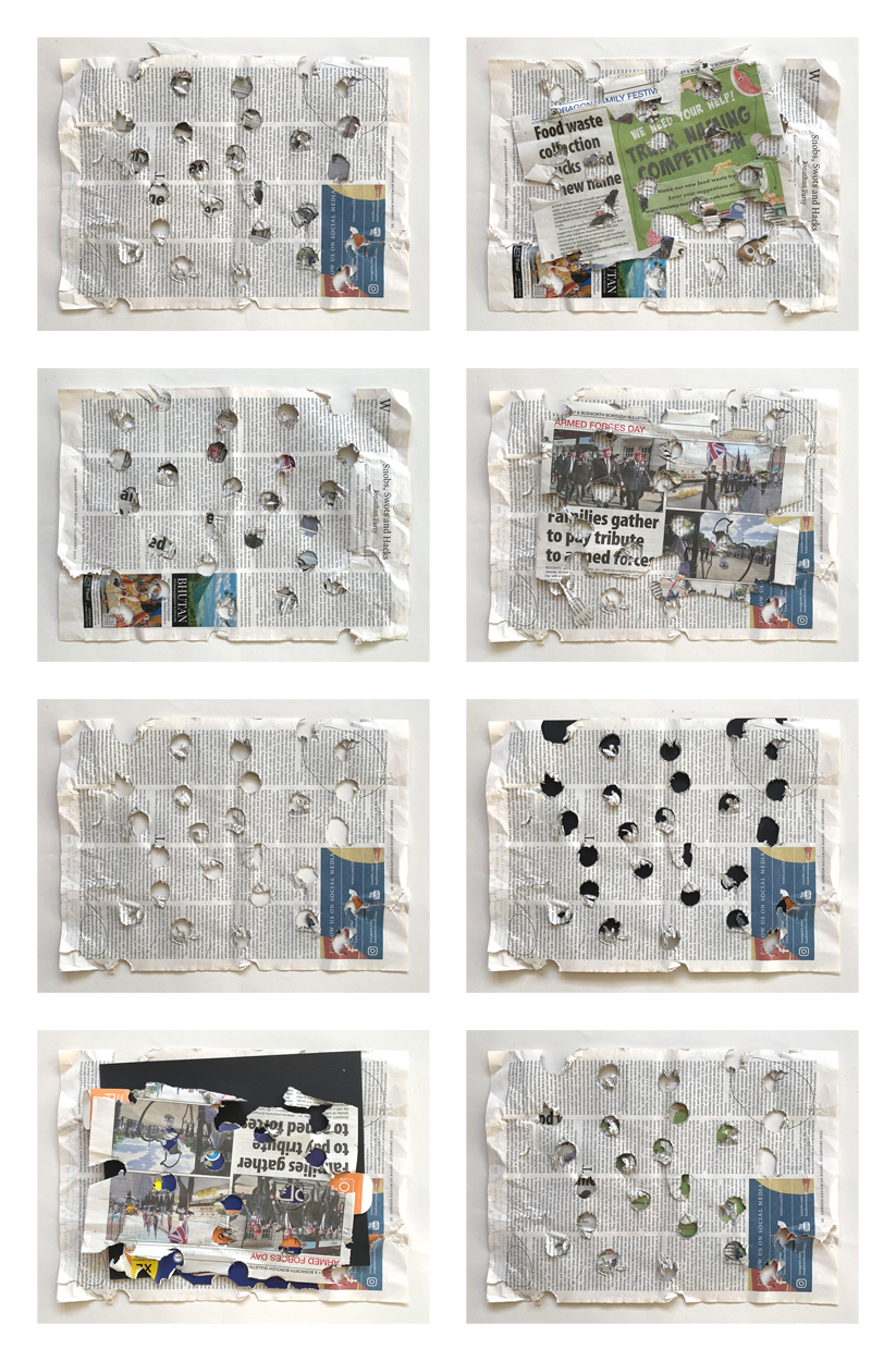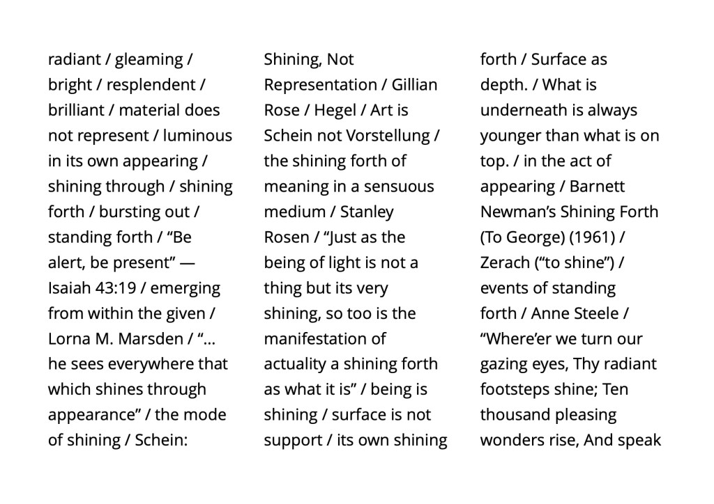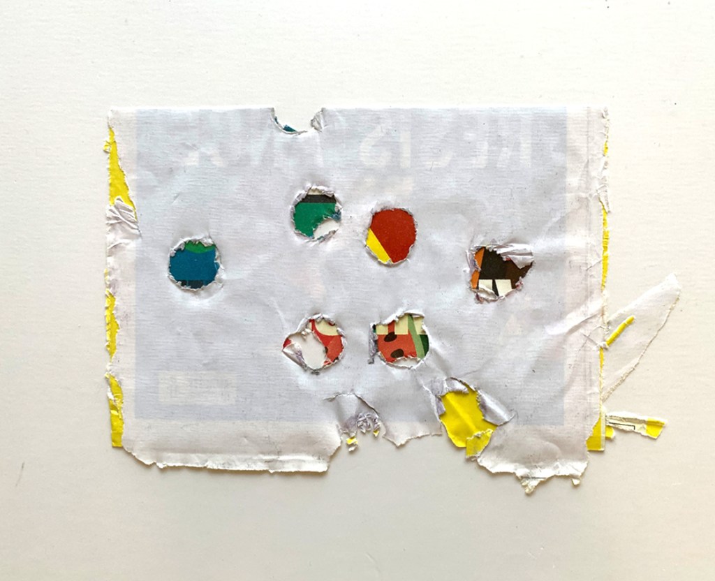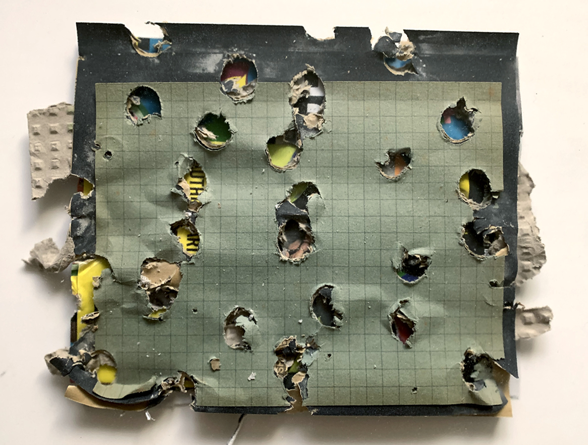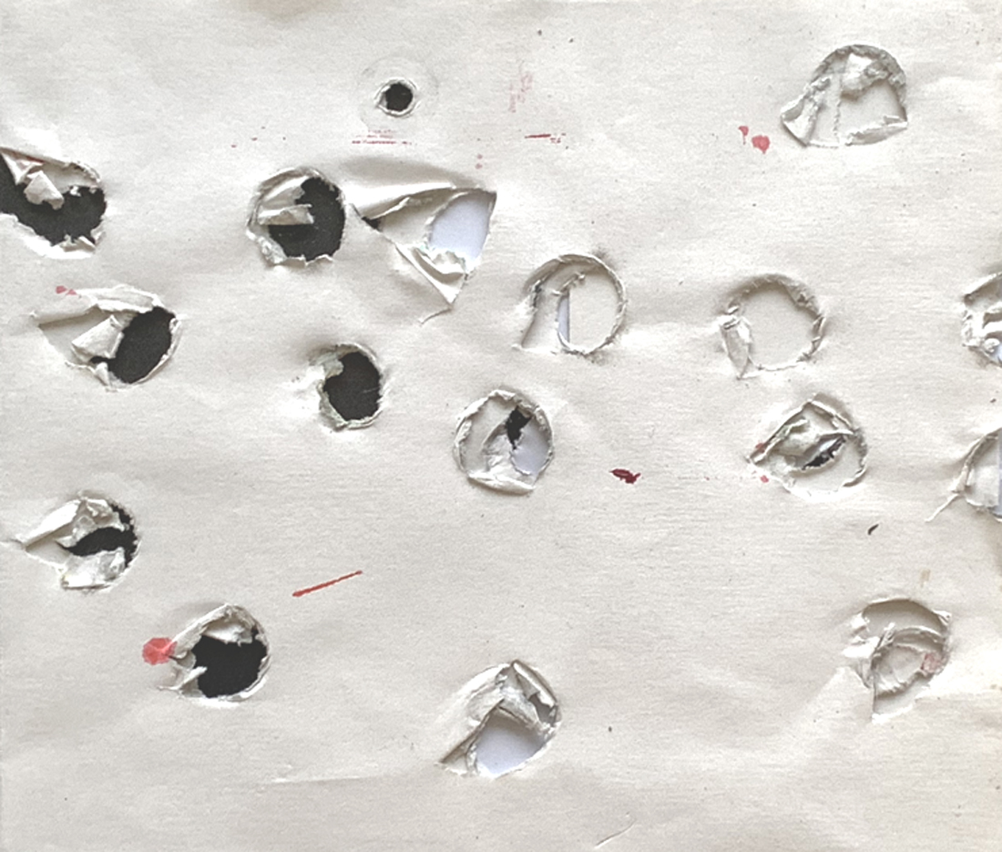 dozens of pinholes in the canvas / the flat areas of dots / a two-dimensional sculpting medium / a thin wash of white paint / translucency / the related corollaries of depth, texture, and light / luminous planes / sprinkling square-cut confetti onto paper and painting prototypes based on how they landed / optical mixing within three-dimensional space / jubilant and rowdy popular culture