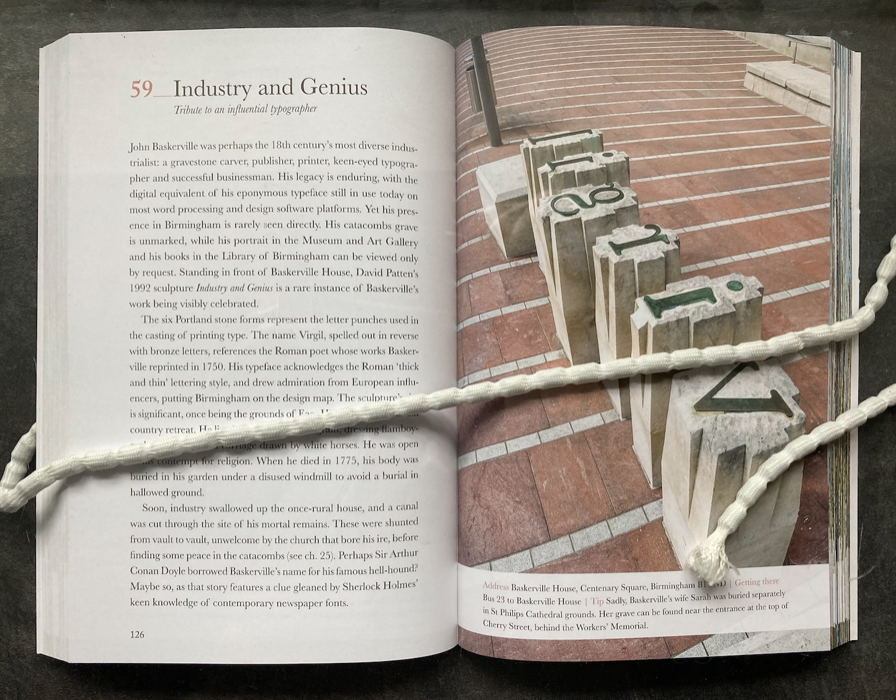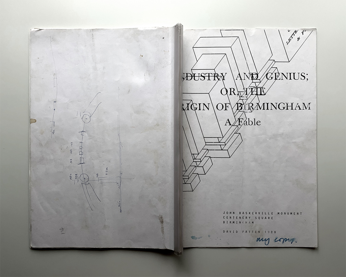 “For Patten, Baskerville is Birmingham, and when he returned to the city in 1983, Baskerville was one of five key reference points that he began working with.” [The other reference points were the poet John Freeth, the painter Samuel Lines, the historian William Hutton, and the missing parts of Richard Westmacott’s ‘Statue of Horatio Nelson’.]