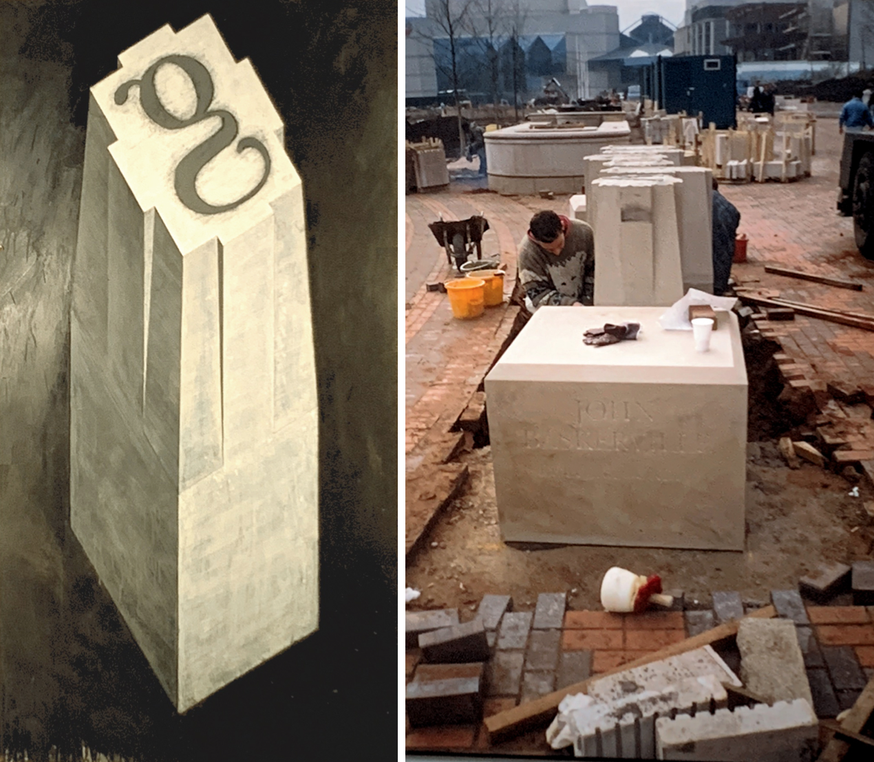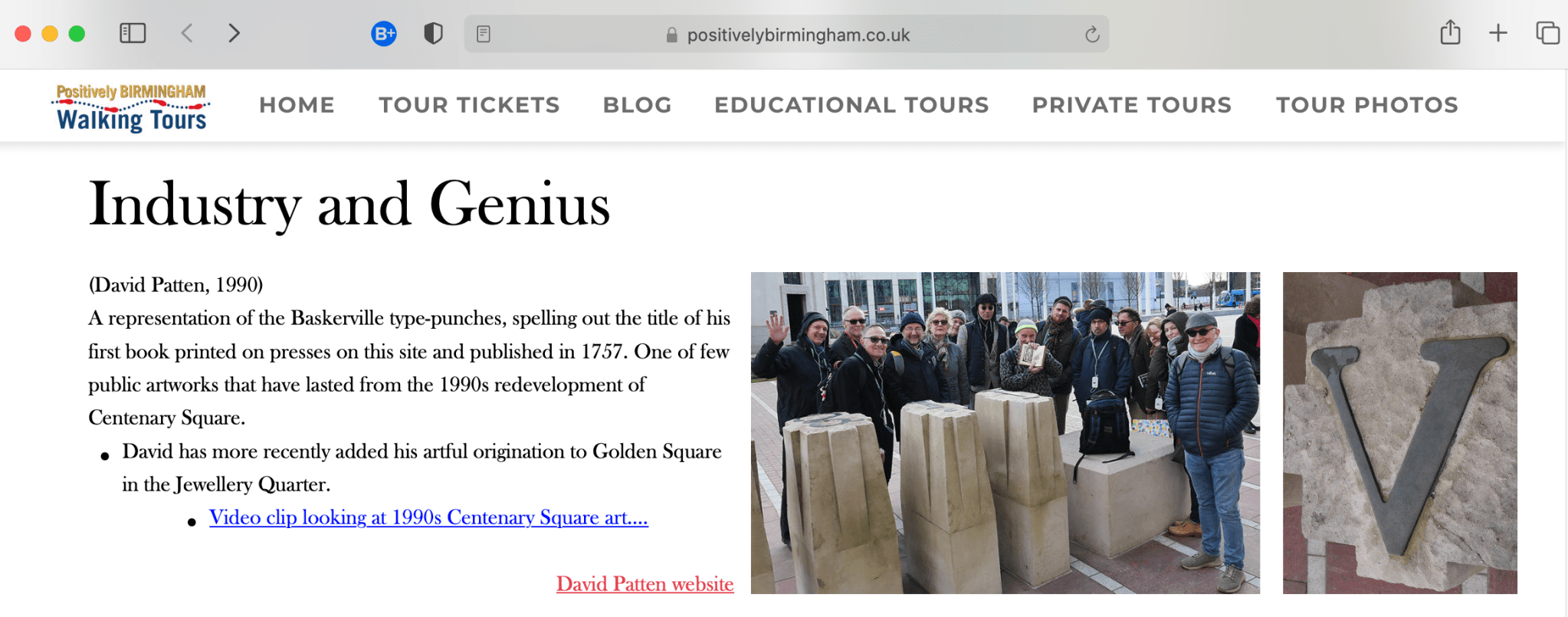 What makes Patten’s sculpture so unusual and effective a public work is its address to the significance of Baskerville as typographer, its identification of the typeface as the focus for public celebration. For what has been more important to the development of social, cultural and political awareness in the modern age than the clarity of good printing and the vernacular translation of great texts? That is the democratic significance of Baskerville’s work, and to recognize that is the quite proper work of this sculpture… / …Patten has moved beyond the purist abstraction of modernist sculpture, combining word and motif to bring history and narrative back into the space of the city: a story is told; a history is implied.