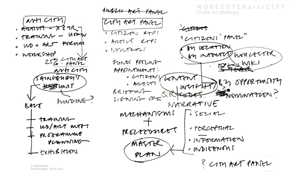 Our initial focus (October 2011 to May 2012) was to produce new public art guidance (and for this to be both vision-led and appropriate to NPPF and cultural well-being), to look closely at four large chunks of the city centre (via walking, talking and drawing), and to explore the possibilities for a new East/West axis connecting across the city (Worcester tends to be orientated North/South because of the River Severn). Throughout this first phase we also maintained an on-line ‘sketchbook’ (in the form of a limited audience blog) that more closely resembles Ingold’s “convergence of lines of interest rather than a bounded field of study”.