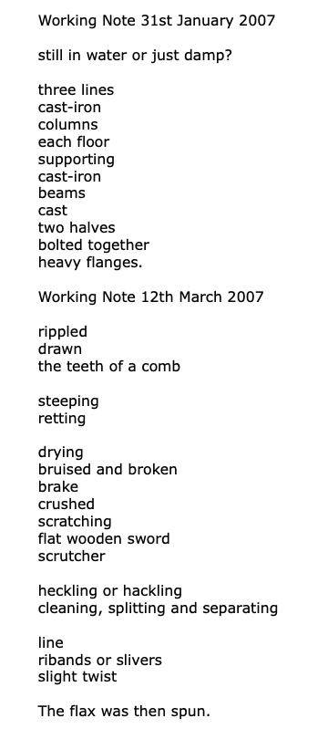 Wormholes through time open up, and memories of what was once here leak out into the present moment. And the future possibility. A letter from Bage to Strutt calculating the strength of beams, or Marshall’s later character assasination of Bage, or the plight of Jeremiah France of 16 Spring Gardens, overseer at the factory; the sound of the scrutcher on the flax brought here from the Low Countries, the Baltic, Ireland and Normandy; the liquidation of 1886 when the colour faded from the site, or the summer of 1987 when the smells of the malting process stopped infiltrating the washing hanging in neighbouring back gardens.