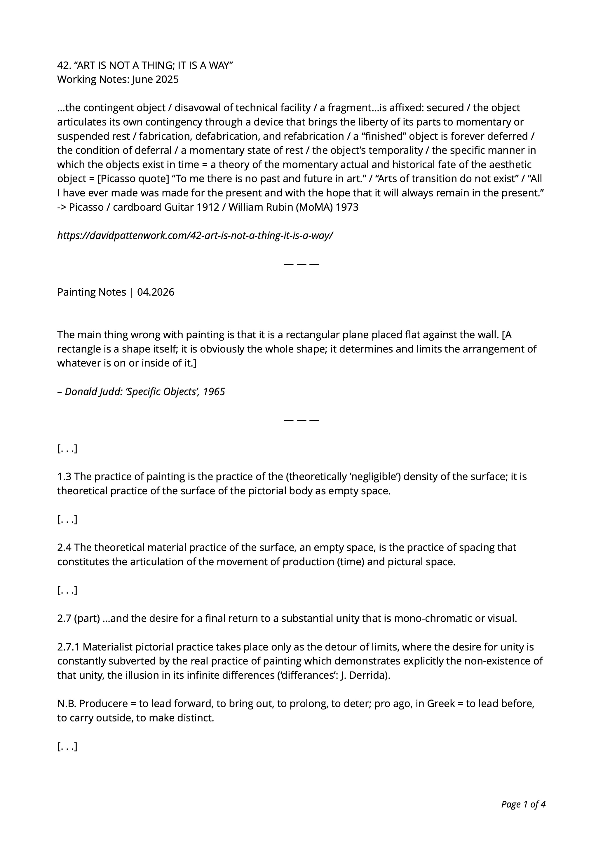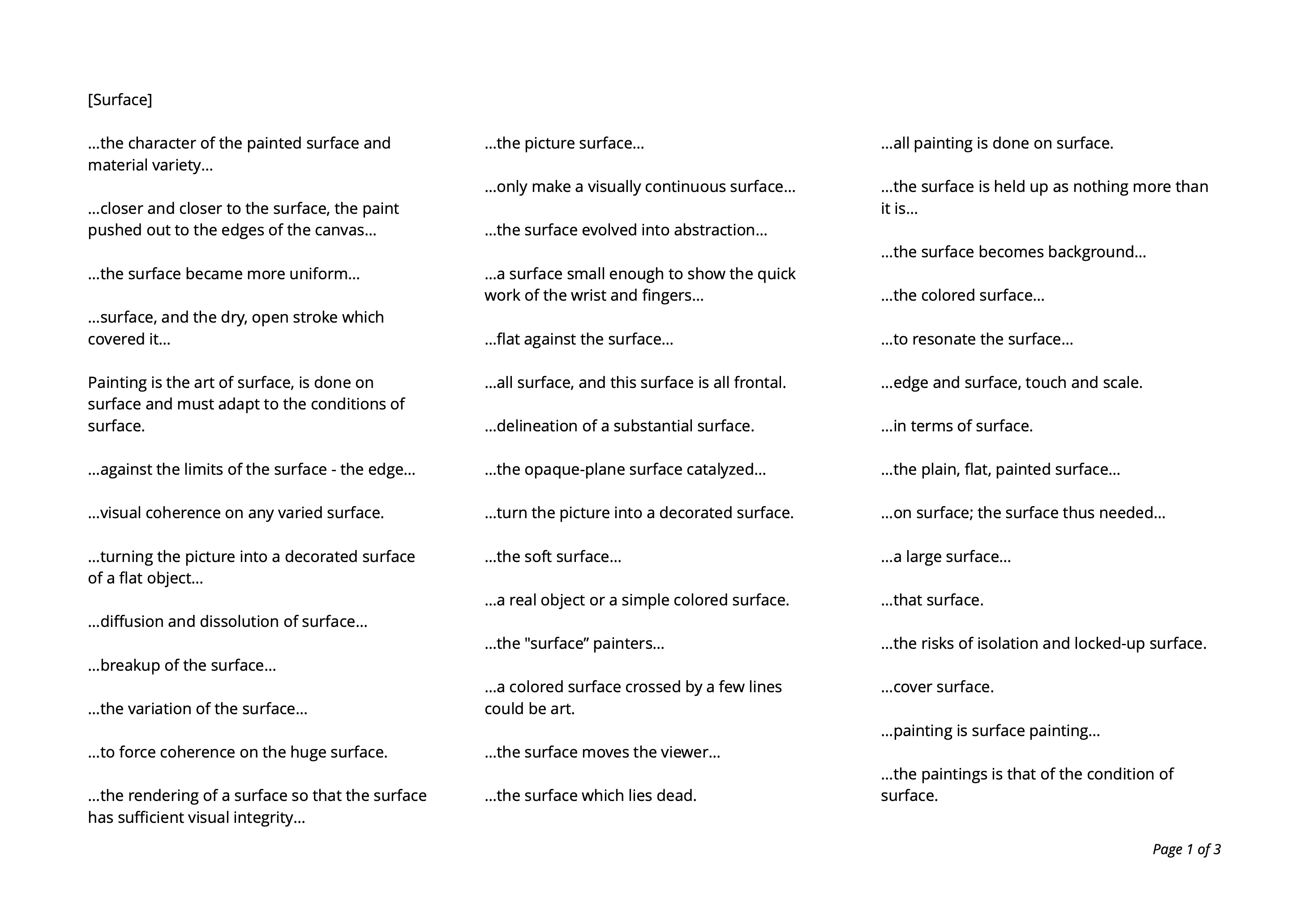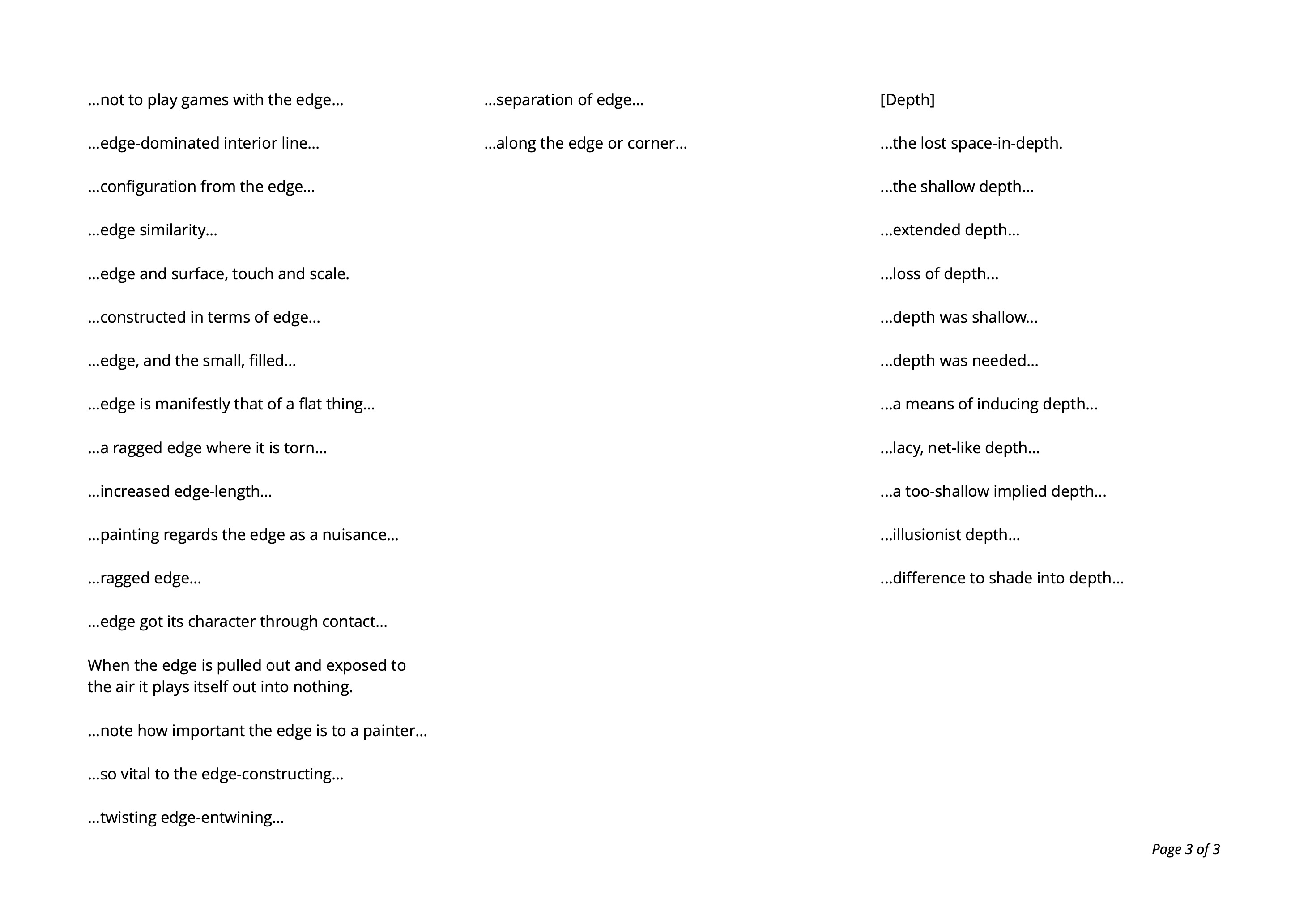 3.1 The real practice of painting is the production, the bringing forward, the mise-en- scène of a ‘density’, of an empty volume, of a surface that has been doubled, prolonged, deferred by the articulation of colours on the plane surface.