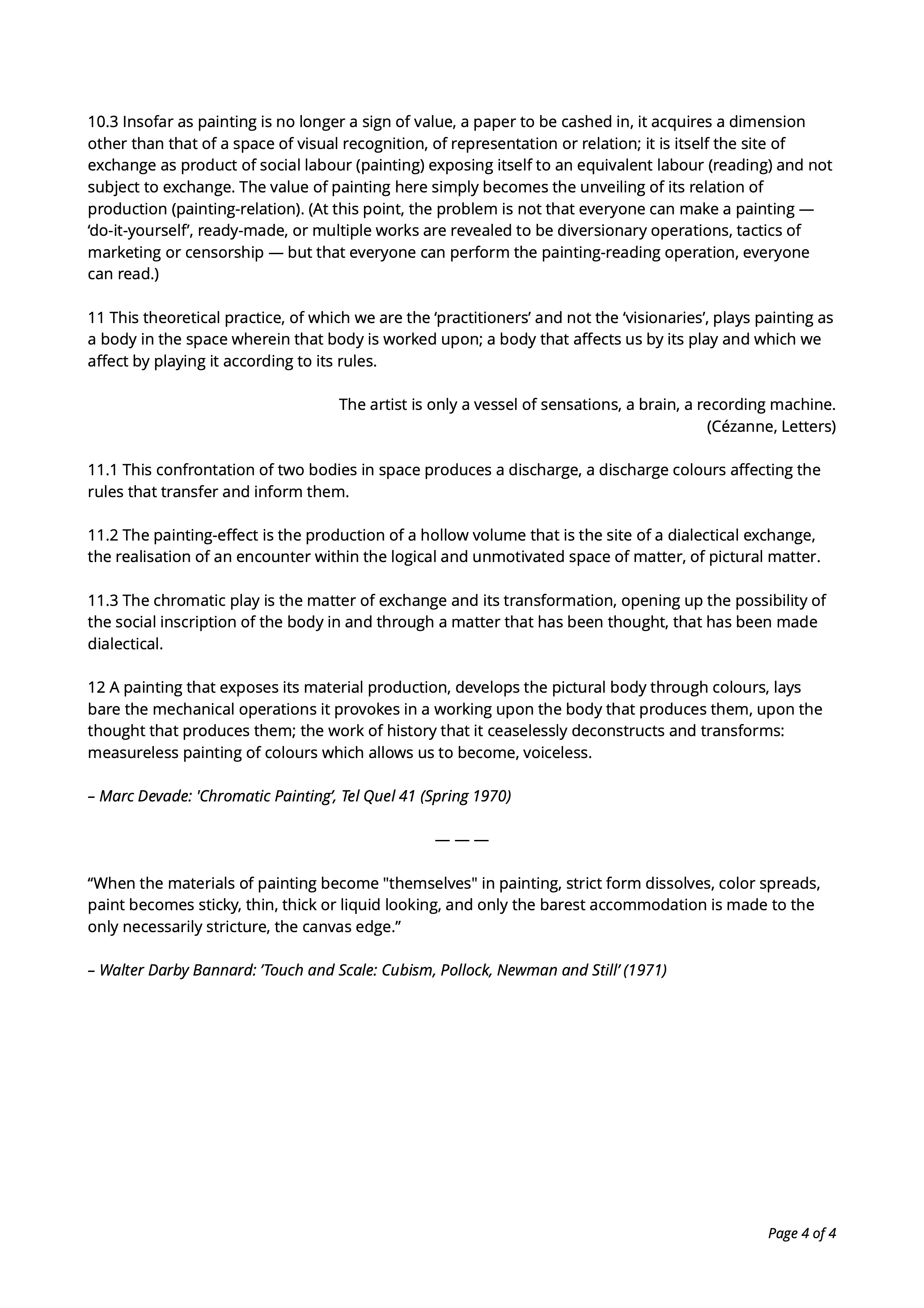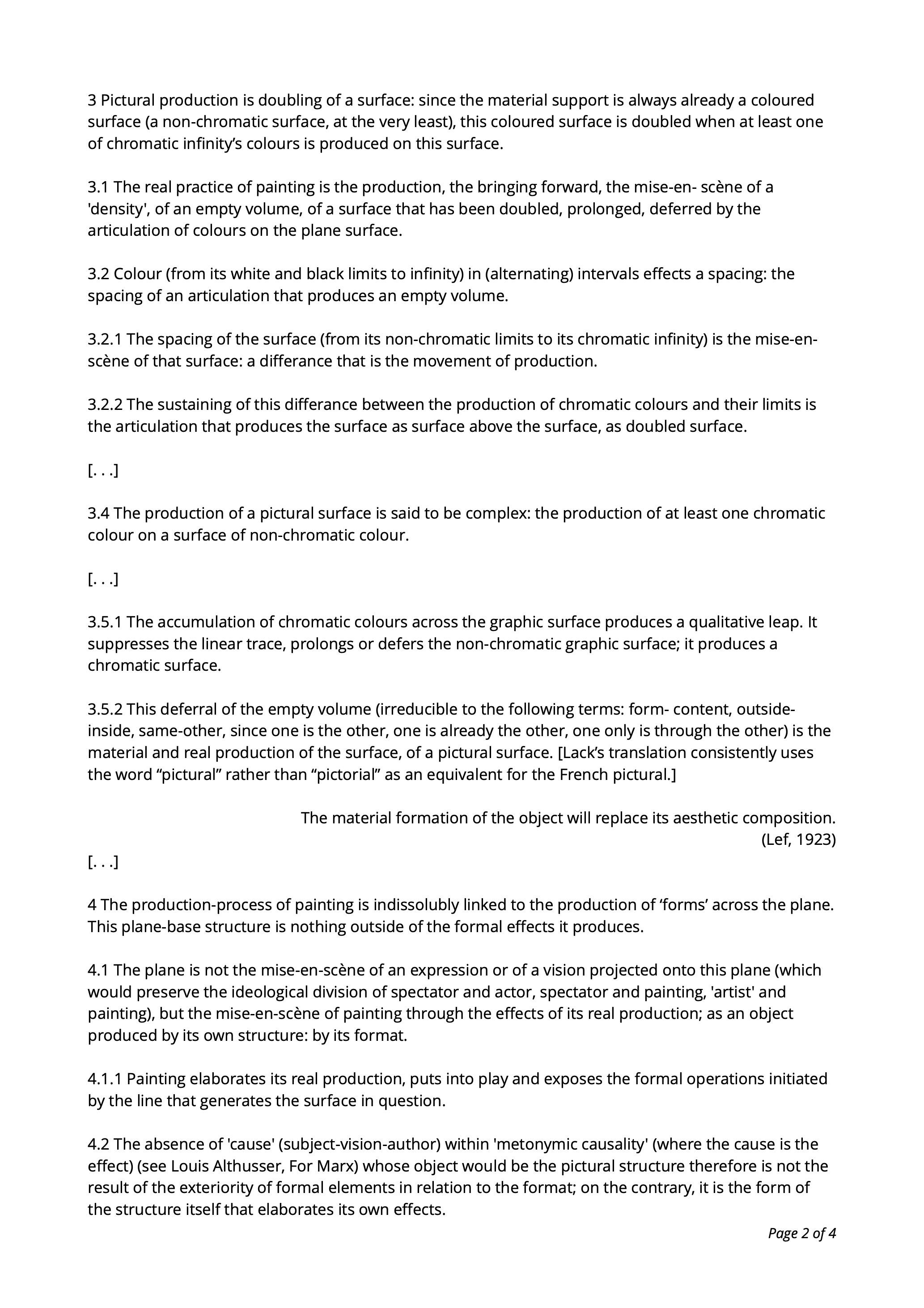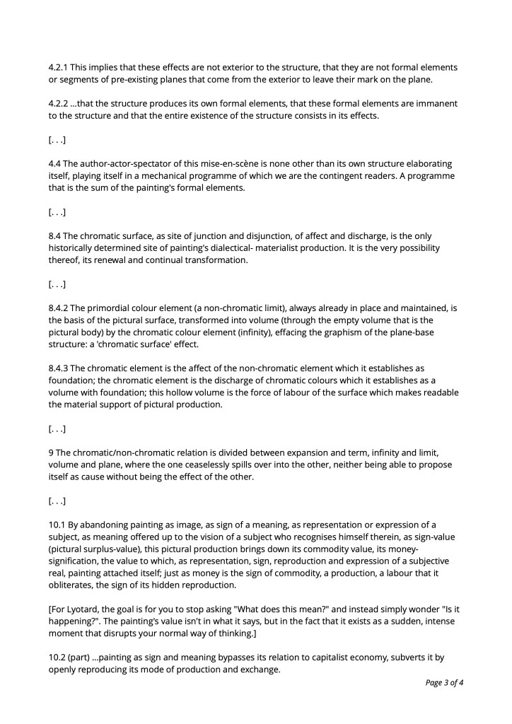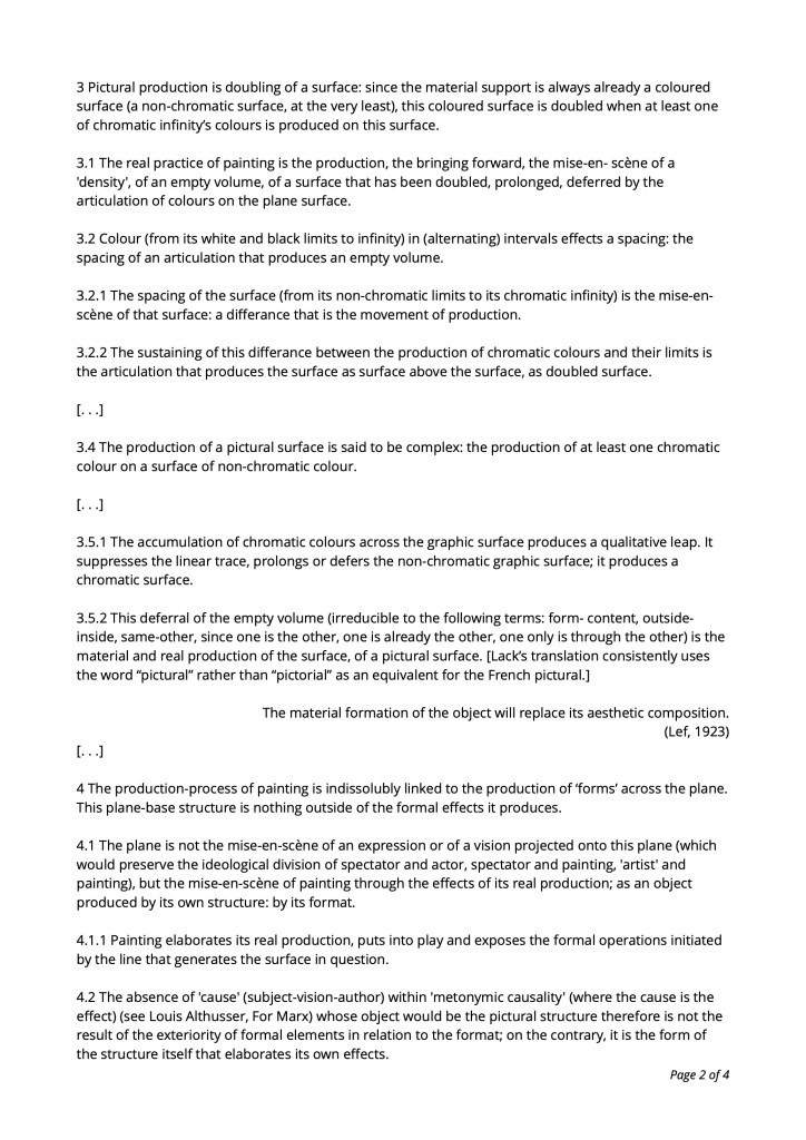 3 Pictural production is the doubling of a surface: since the material support is always already a coloured surface (a non-chromatic surface, at the very least), this coloured surface is doubled when at least one of chromatic infinity’s colours is produced on this surface.